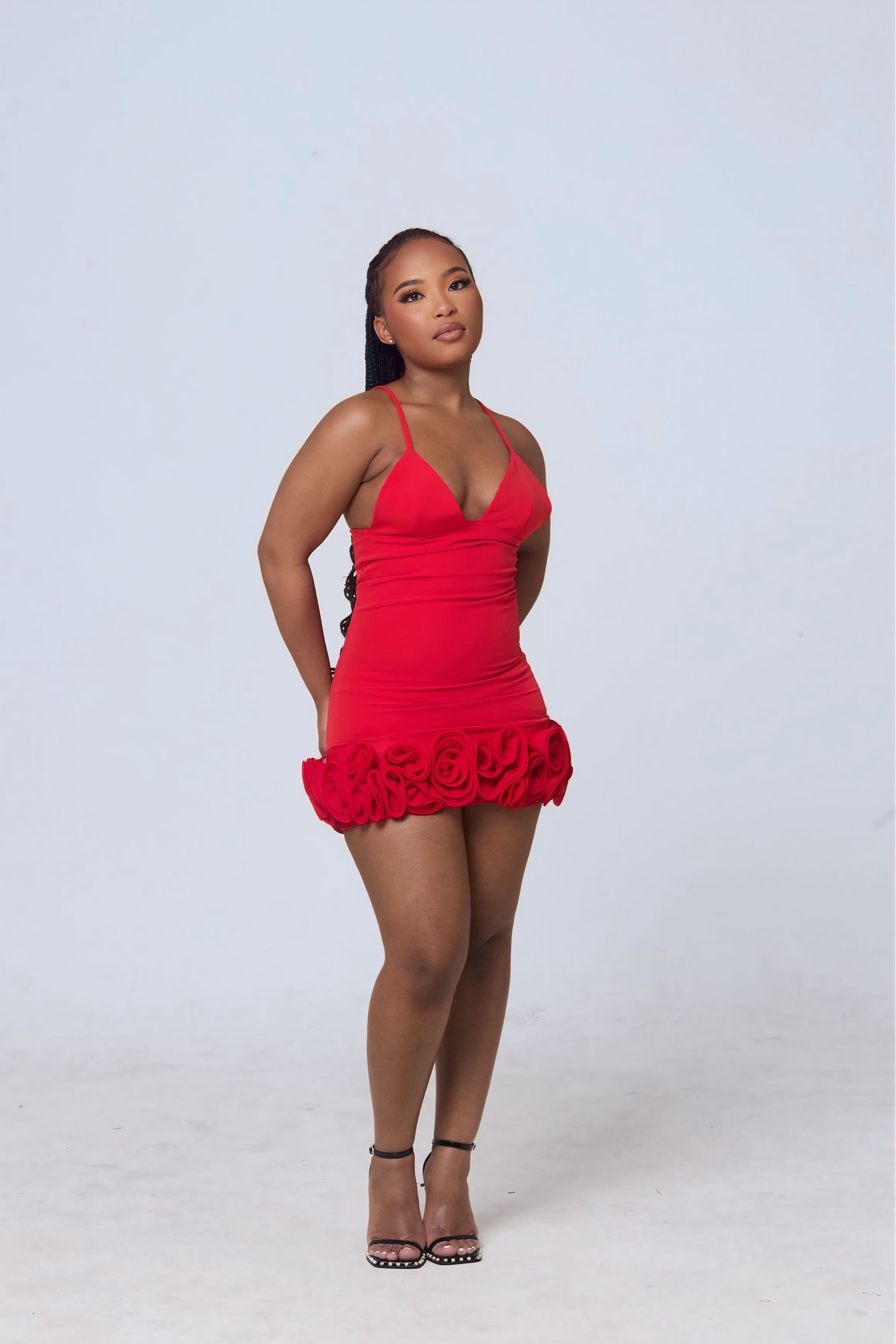 The Sarafina Rosette Mini Dress is a striking red statement piece with a 3D rosette hemline and plunging neckline, perfect for celebratory occasions.