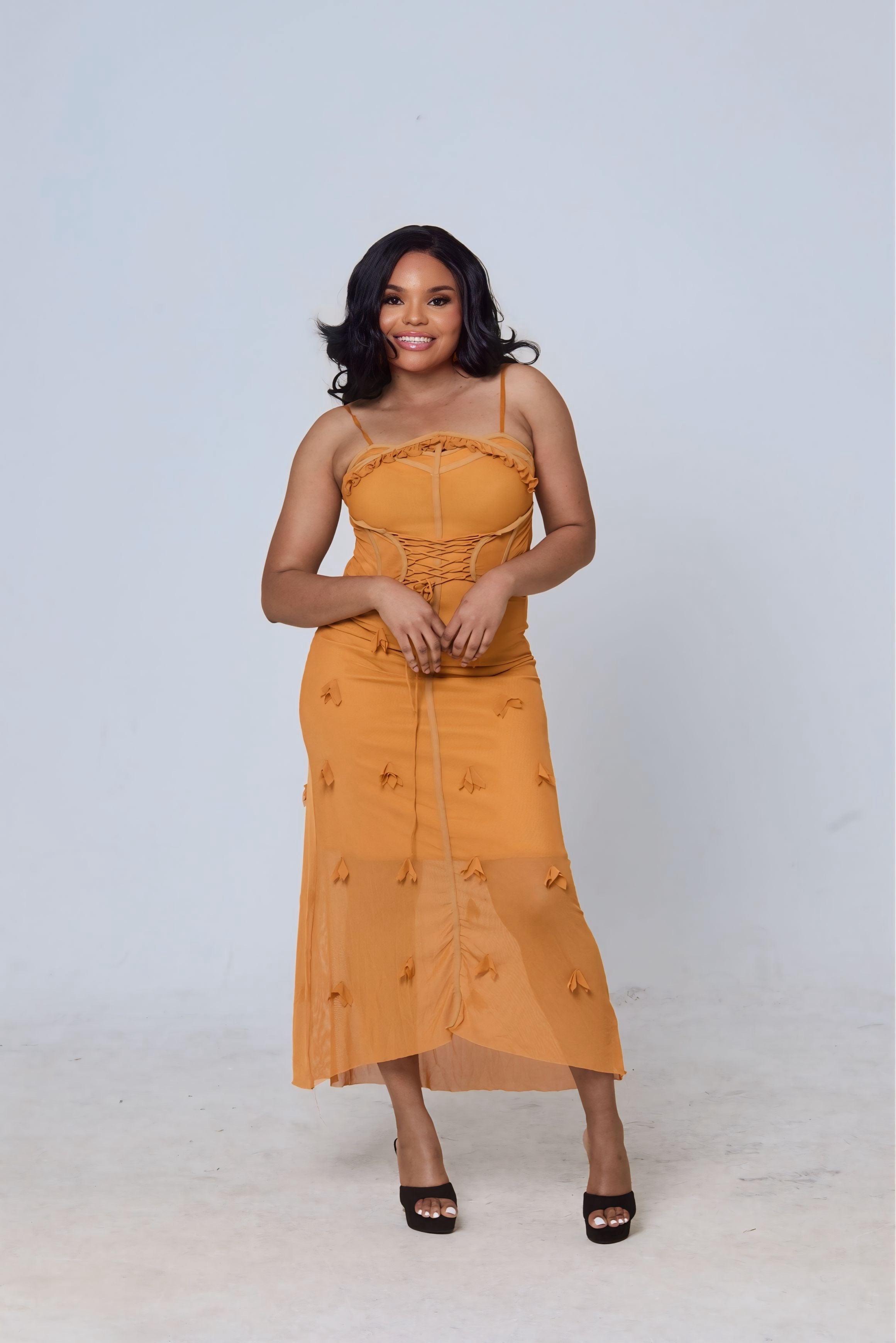 Radiate confidence in the Amber Corset Dress — a golden statement of elegance and allure. Featuring a sculpted corset bodice, ruffled neckline, and soft applique details, it beautifully hugs every curve for a timeless feminine look.